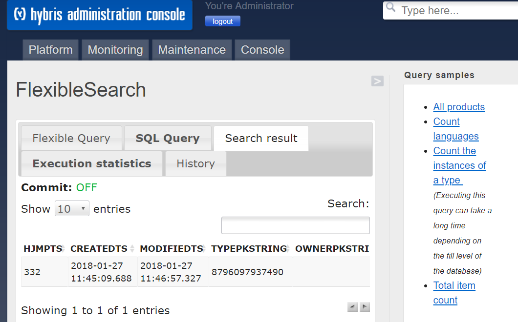 类似SE16,也可以直接在Hybris Admin console里执行执行flexible search: