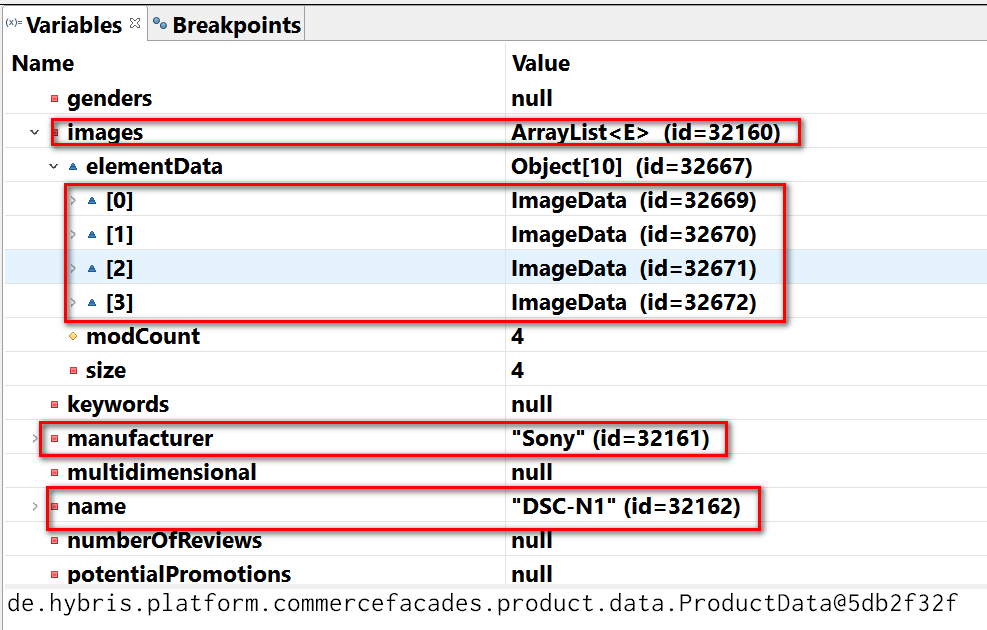 从DB里取出的product数据和在debugger里观察到的一致。可以看看Hybris里product有哪些重要的field: