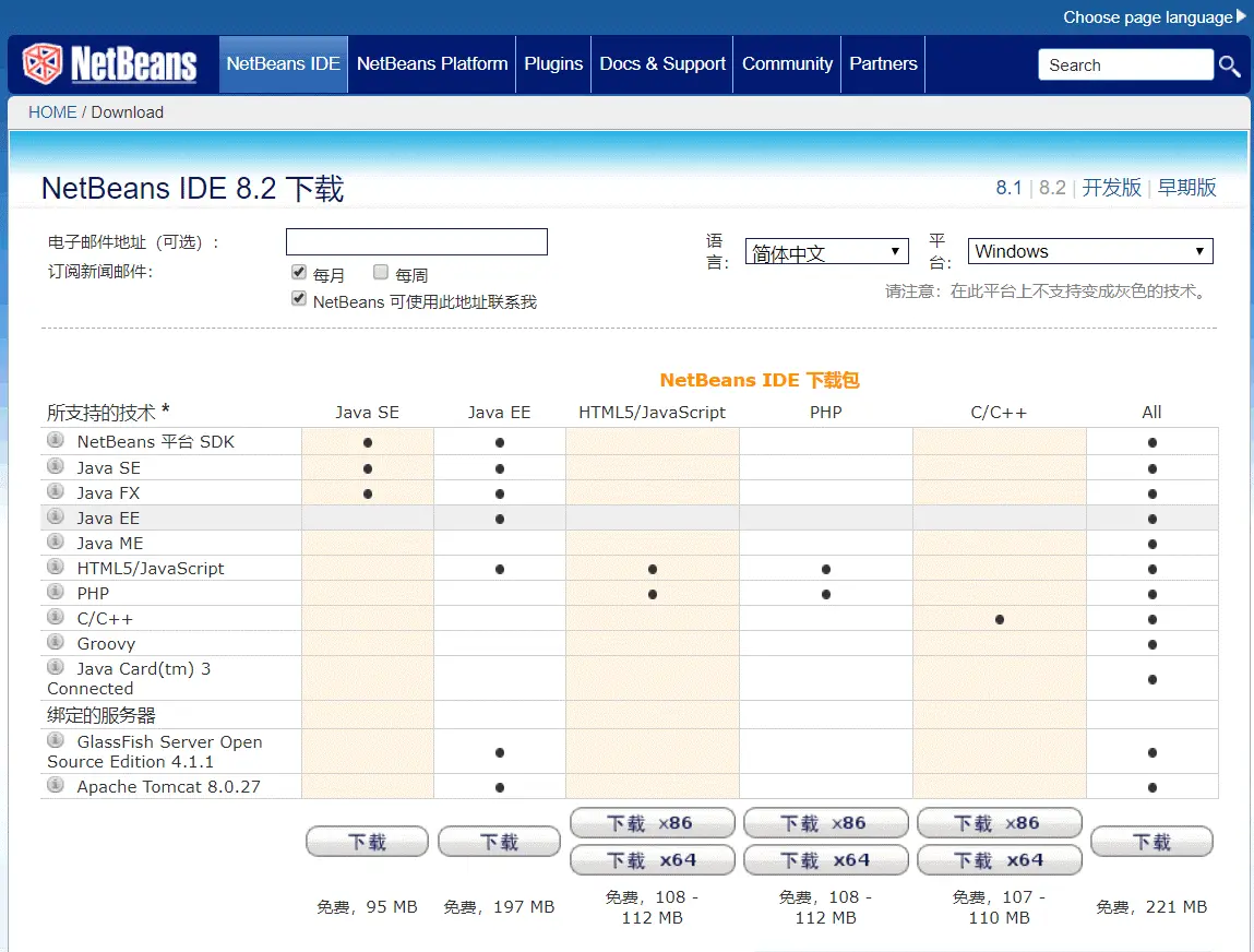 NetBeans的下载包非常人性化,提供了多种打包好的下载包,可以根据自己的需求下载。