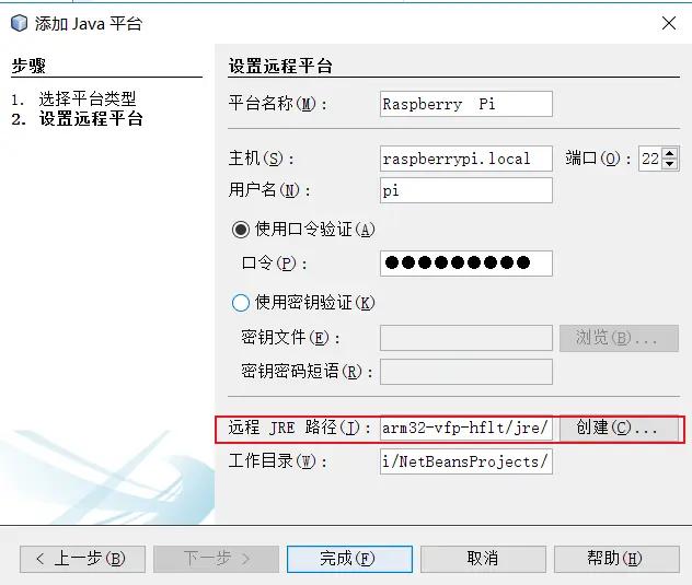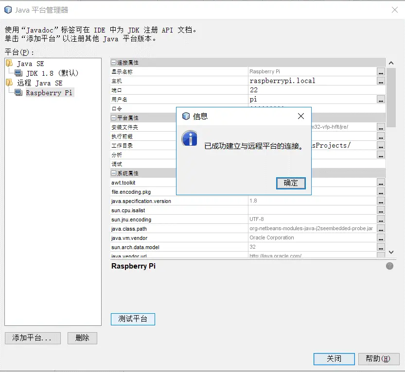确定好NetBeans后,接下来为树莓派的开发选择Java平台,最为重要的是为其设置远程平台时填写。树莓派的远程JRE路径。关于树莓派的远程JRE路径,可以在SSH登录树莓派时,输入命令sudo update-alternatives --display java得知树莓派的远程JRE路径为:/usr/lib/jvm/jdk-8-oracle-arm32-vfp-hflt/jre/。完成后测试平台。