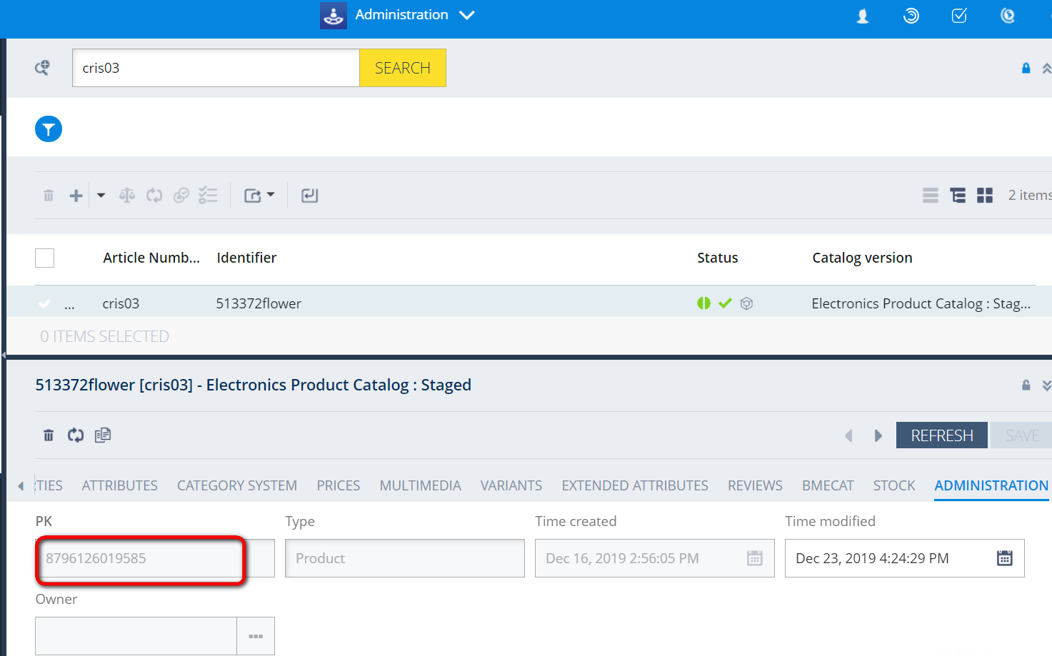 PK:产品实例的主键。这个值在Backoffice product Administration标签页里能查到: