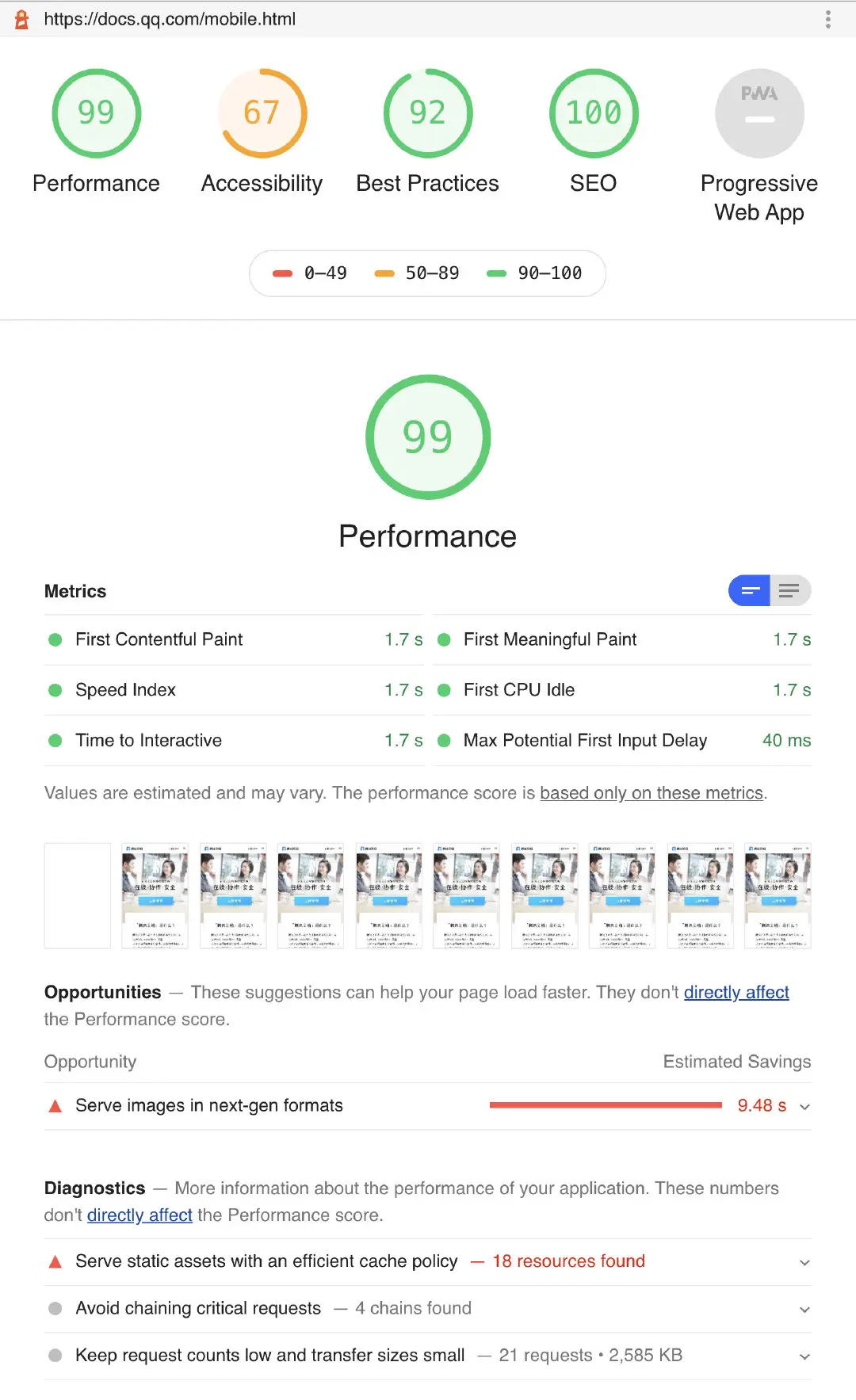 展示了白屏、首屏、可交互时间等性能指标和 SEO、PWA 等。