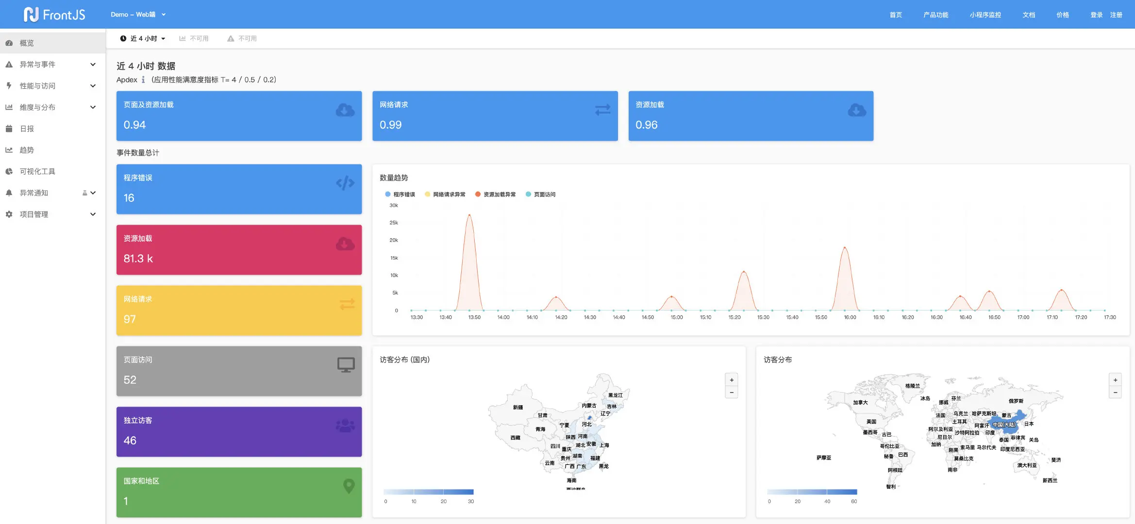 功能包括:大盘数据、特征统计、慢加载追踪、访问页面、脚本错误、AJAX、组合分析、报表、告警等等。