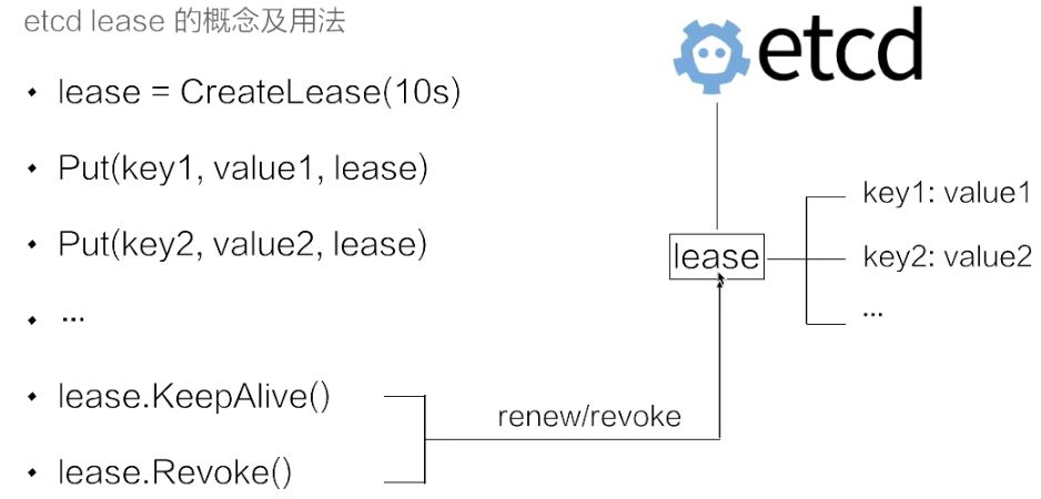比如说需要检测分布式系统中一个进程是否存活,可以在进程中去创建一个租约,并在该进程中周期性的调用 KeepAlive 的方法。 如果一切正常,该节点的租约会一致保持,如果这个进程挂掉了,最终这个租约就会自动过期。