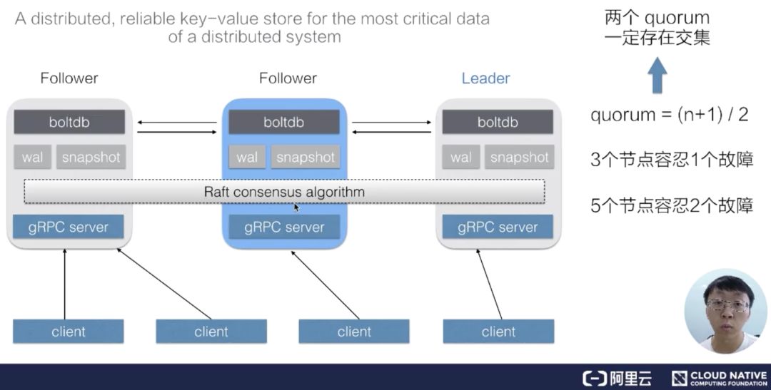 在 etcd 整个架构中,有一个非常关键的概念叫做 quorum,quorum 的定义是 (n+1)/2,也就是说超过集群中半数节点组成的一个团体,在 3 个节点的集群中,etcd 可以容许 1 个节点故障,也就是只要有任何 2 个节点可用,etcd 就可以继续提供服务。 同理,在 5 个节点的集群中,只要有任何 3 个节点可用,etcd 就可以继续提供服务,这也是 etcd 集群高可用的关键。
