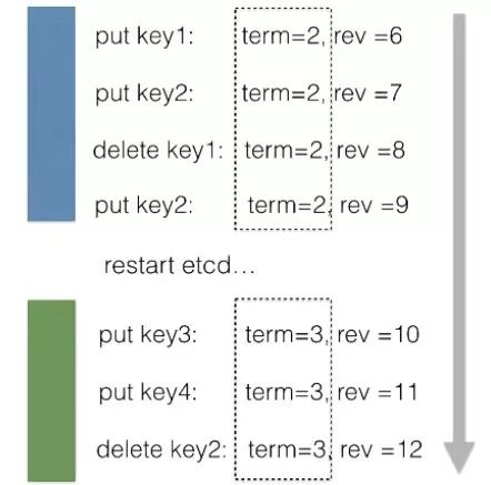 在同一个 Leader 任期之内,我们发现所有的修改操作,其对应的 term 值始终都等于 2,而 revision 则保持单调递增。当重启集群之后,我们会发现所有的修改操作对应的 term 值都变成了 3。