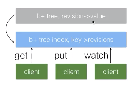 灰色的 b+tree 中维护着 revision 到 value 的映射关系,支持通过 revision 查询对应的数据。 因为 revision 是单调递增的,当我们通过 watch 来订阅指定 revision 之后的数据时,仅需要订阅该 b+ tree 的数据变化即可。
