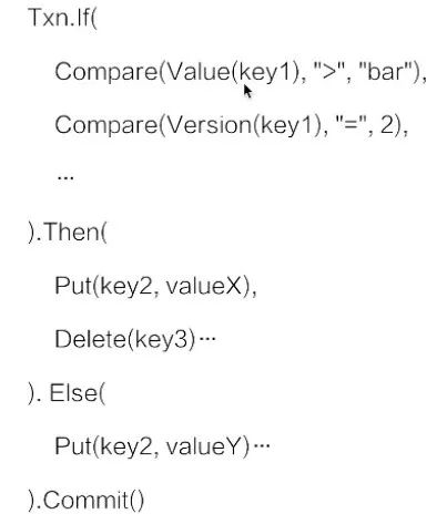 etcd 的 transaction 机制比较简单,基本可以理解为一段 if-else 程序,在 if 中可以提供多个操作,如下图所示: