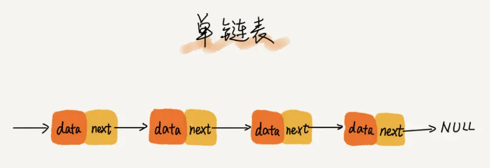 链表通过指针将一组零散的内存块串联在一起。其中,我们把内存块称为链表的“结点”。为了将所有的结点串起来,每个链表的结点除了存储数据之外,还需要记录链上的下一个结点的地址。如图所示,我们把这个记录下个结点地址的指针叫作后继指针 next。