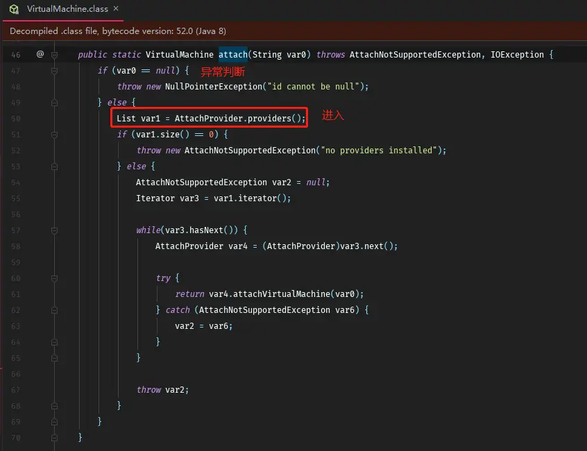回到最初的VirtualMachine.attach(String var0)方法,进入return var4.attachVirtualMachine(var0);的attachVirtualMachine()内