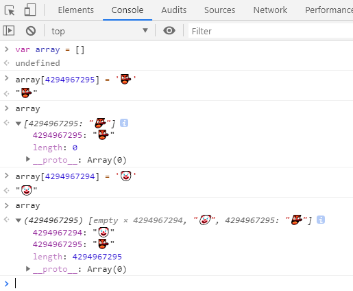 上面在测试索引值时,虽然看见无效值索引值 4294967295 在打印 array 时,依旧能看到。但它其实只是作为普通对象属性存在。如果用 for...of 循环遍历,发现并不会看见它。因为遍历是基于 length 属性的。length 属性为 0,自然认为数组里是空的。