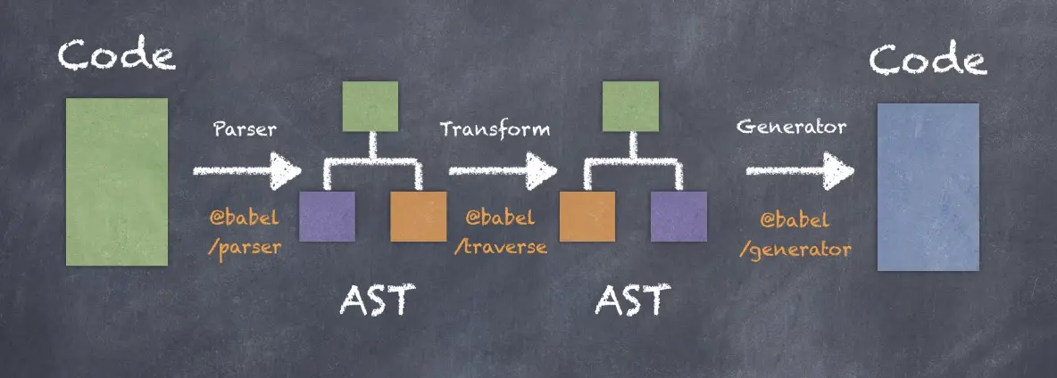 解析(词法分析、语法分析) 得到AST -> 转换 (visitor 遍历器引入插件 得到新的AST) -> 生成代码