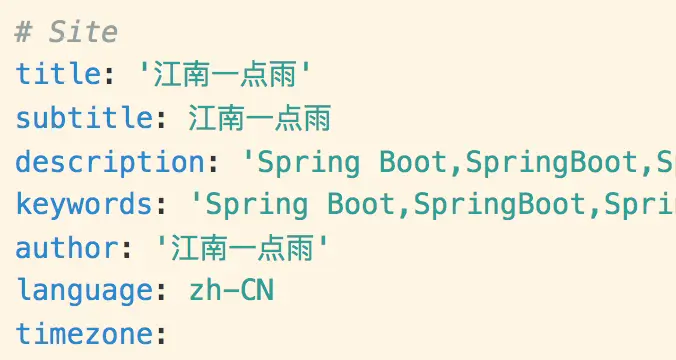 这里几个文件/文件夹,我们先来关注其中两个 _config.yml 和 themes 目录, _config.yml 文件中,我们可以做网站的一些基本配置,例如 网站的 title,描述,关键字、图标等,这些配置大都见名知意。如下: