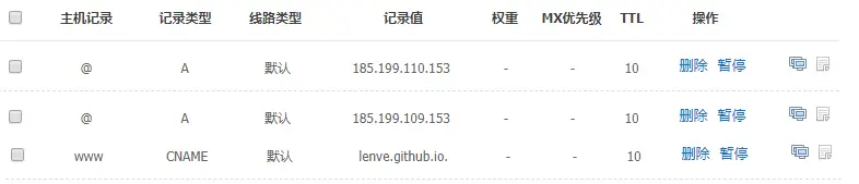 添加两条 A 记录,指向 GitHub 的 IP 地址,再添加一条 CNAME ,指向你的 GitHub 域名就可以了。