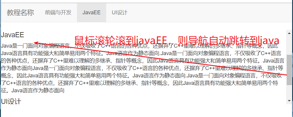 01 02 03 04 05 06 07 08 09 10 11 12 13 14 15 16 17 18 19 20 21 22 23 | <div data-spy="scroll" data-target="#myScrollspy" data-offset="0" style="height:200px;overflow:auto; position: relative;"> <h4 id="qianduan">前端与开发</h4> <p>前端开发是创建Web页面或app等前端界面呈现给用户的过程。前端开发通过HTML,CSS及JavaScript以及衍生出来的各种技术、框架、解决方案,来实现互联网产品的用户界面交互 [1] 。它从网页制作演变而来,名称上有很明显的时代特征。在互联网的演化进程中,网页制作是Web1.0时代的产物,早期网站主要内容都是静态,以图片和文字为主,用户使用网站的行为也以浏览为主。随着互联网技术的发展和HTML5、CSS3的应用,现代网页更加美观,交互效果显著,功能更加强大。 </p> <h4 id="java">JavaEE</h4> <p>Java是一门面向对象编程语言,不仅吸收了C++语言的各种优点,还摒弃了C++里难以理解的多继承、指针等概念,因此Java语言具有功能强大和简单易用两个特征。Java语言作为静态面向.Java是一门面向对象编程语言,不仅吸收了C++语言的各种优点,还摒弃了C++里难以理解的多继承、指针等概念,因此Java语言具有功能强大和简单易用两个特征。Java语言作为静态面向Java是一门面向对象编程语言,不仅吸收了C++语言的各种优点,还摒弃了C++里难以理解的多继承、指针等概念,因此Java语言具有功能强大和简单易用两个特征。Java语言作为静态面向.Java是一门面向对象编程语言,不仅吸收了C++语言的各种优点,还摒弃了C++里难以理解的多继承、指针等概念,因此Java语言具有功能强大和简单易用两个特征。Java语言作为静态面向 </p> <h4 id="ui">UI设计</h4> <p>UI设计(或称界面设计)是指对软件的人机交互、操作逻辑、界面美观的整体设计。UI设计分为实体UI和虚拟UI,互联网说的UI设计是虚拟UI,UI即User Interface(用户界面)的简称。UI设计(或称界面设计)是指对软件的人机交互、操作逻辑、界面美观的整体设计。UI设计分为实体UI和虚拟UI,互联网说的UI设计是虚拟UI,UI即User Interface(用户界面)的简称。 </p></div> |