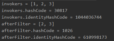 可以看到经过 filterInvoker 方法后,由于集合中所有的元素都满足条件,所以过滤前后,集合中的元素并没有发生变化,导致 hashCode 没有变化。但是由于装元素的容器(集合)已经不是原来的容器了,所以 identityHashCode 发生了变化。