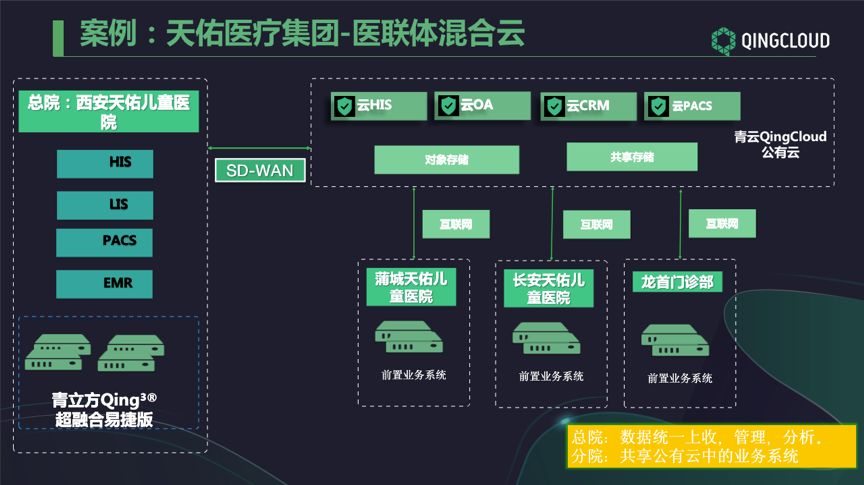 通过采用青立方®️ 超融合易捷版快速搭建了天佑儿童医院信息化基础设施平台,以该院为中心,覆盖各二级医院及门诊,承载医院的 HIS、PACS、LIS、EMR 等基础业务,并且满足 HIS、PACS 等医院关键业务对于 IT 基础架构设施高性能、高可靠、可扩展、简单易用的需求;青立方 ®️ 超融合易捷版采用分布式架构及多副本机制实现了天佑医院重要核心业务的高可用性,实现业务持续无间断运行,和数据的零丢失;同时将集团互联网业务及门诊业务落地青云QingCloud 公有云,在满足虚拟化资源交付的基础上提供极简的运维管理,同时可随着业务增长,能够实现从本地私有云环境到公有云的的平滑过渡,实现了真正公私一体的混合云业务架构。