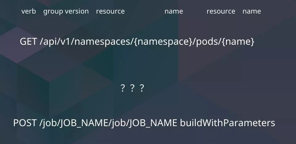 我们再来看 Jenkins 的 API,Jenkins 的 API 看起来是一堆不知道是什么的东西,Jenkins 在设计之初不是基于 API 的服务,这导致它的一些差距。我们可以看 K8s 的界面方式,K8s 的方式是基于 Rest API 的路径和动作进行鉴权的。但在 Jenkins 当中,从一些代码里内嵌检查语句,看这个人是不是有管理权限或者读权限等。这说明我们很难借助 K8s 的能力把它鉴权。