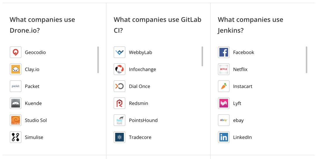 这是使用 Jenkins 的代表企业,可以从代表企业看出,我们不了解这些企业具体是做什么的,只有 Jenkins 的代表企业我看的比较眼熟,比如 Facebook、Netflix、ebay 等这种比较出名的国外大型企业,说明他们企业内部的复杂流水,使用 Jenkins 是可以满足的。