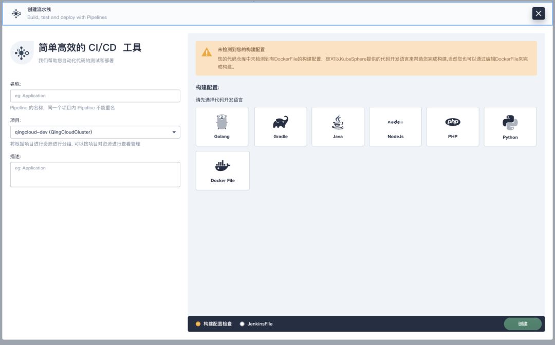 我们 DevOps 流水线和 S2I/B2I 可以满足绝大多数用户的需求,包括复杂的 CI/CD 场景,还有简单的 CI/CD 场景。我们还会有一些优化点,这是我们 KubeSphere 中的页面。