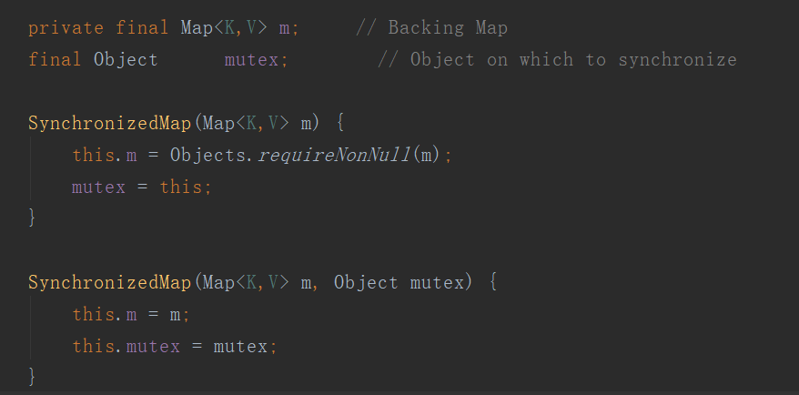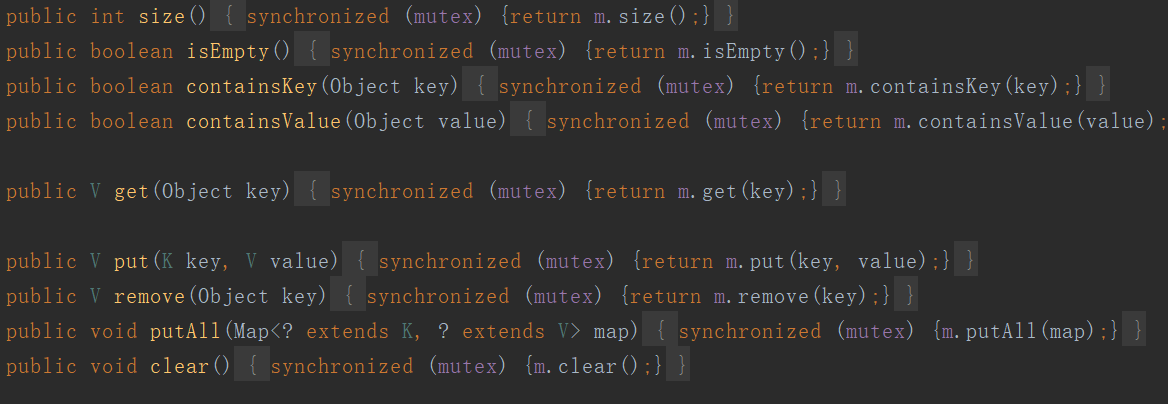 synchronizedMap在内部维护了一个map对象和一个排斥锁mutex。