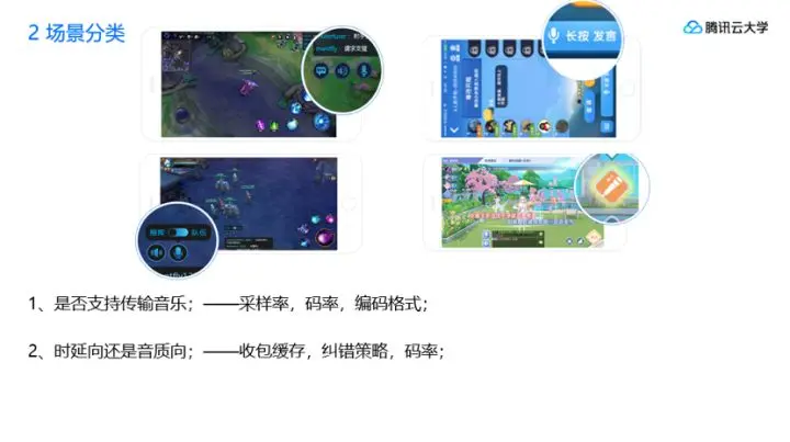 当然如果用户对消耗不那么看重,或者说像狼人杀这种语音就是游戏本身,我们也支持超宽带编码,可以完美的还原人声。在国战指挥场景下,因为很多玩家都喜欢播一点战歌,如果场景带音乐我们选择使用AAC_lc进行音乐编码,码率也同步提升到48k,但同时编解码消耗也将上升。最后是音乐纯直播的高音质场景,我们使用音乐效果最好的AAC_hev2,码率上限也大大提升。