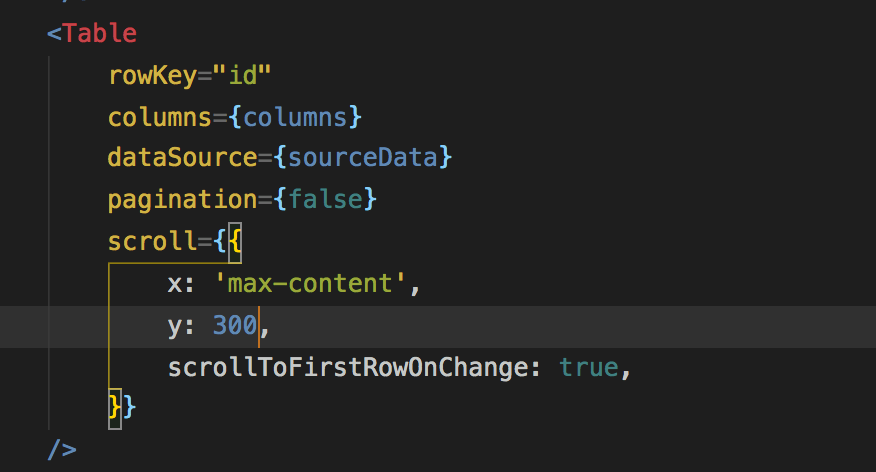 使用表格自身的翻页或者表格有排序功能,想要在每次change的时候需要将滚动条位置回到顶端,则使用它自身的一个配置项 scrollToFirstRowOnChange,如下: