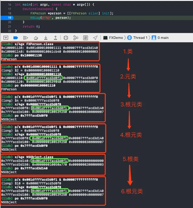 我们先用p/x打印类的内存地址,再用x/4gx打印内存结构取到对应的isa,再用mask进行偏移得到isa指向的上级(等同于object_getClass)依次循环