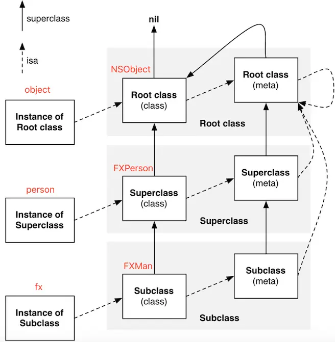 继承关系(实线):NSObject父类为nil,根元类的父类为NSObject