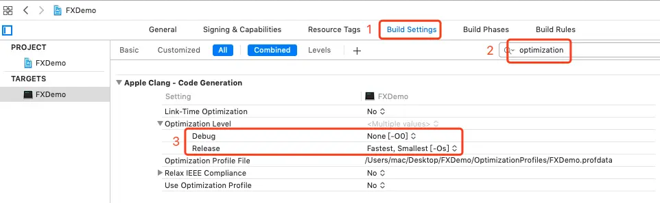 None[-O0]: 不优化。在这种设置下, 编译器的目标是降低编译消耗,保证调试时输出期望的结果。程序的语句之间是独立的:如果在程序的停在某一行的断点出,我们可以给任何变量赋新值抑或是将程序计数器指向方法中的任何一个语句,并且能得到一个和源码完全一致的运行结果。Fast[-O1]: 大函数所需的编译时间和内存消耗都会稍微增加。在这种设置下,编译器会尝试减小代码文件的大小,减少执行时间,但并不执行需要大量编译时间的优化。在苹果的编译器中,在优化过程中,严格别名,块重排和块间的调度都会被默认禁止掉。Faster[-O2]: 编译器执行所有不涉及时间空间交换的所有的支持的优化选项。在这种设置下,编译器不会进行循环展开、函数内联或寄存器重命名。和'Fast[-O1]'项相比,此设置会增加编译时间和生成代码的性能。Fastest[-O3]: 在开启'Fast[-O1]'项支持的所有优化项的同时,开启函数内联和寄存器重命名选项。这个设置有可能会导致二进制文件变大。Fastest, Smallest[-Os]: 优化大小。这个设置开启了'Fast[-O1]'项中的所有不增加代码大小的优化选项,并会进一步的执行可以减小代码大小的优化。Fastest, Aggressive Optimizations[-Ofast]: 这个设置开启了'Fastest[-O3]'中的所有优化选项,同时也开启了可能会打破严格编译标准的积极优化,但并不会影响运行良好的代码。