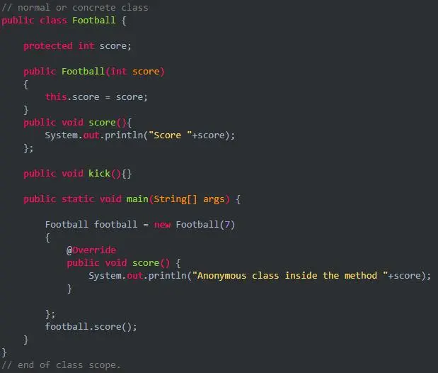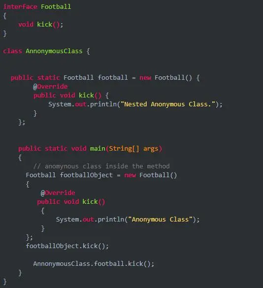 匿名类可以在类和函数代码块中创建。你也许知道,匿名类可以用接口来创建,也可以通过扩展抽象或具体的类来创建。上例中我先创建了一个接口Football,然后在类的作用域和main()方法内实现了匿名类。Football也可以是抽象类,也可以是与interface并列的顶层类。