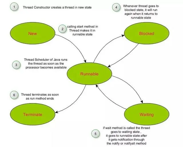 - New:创建线程的实例后,它会进入new状态,这是第一个状态,但线程还没有准备好运行。
