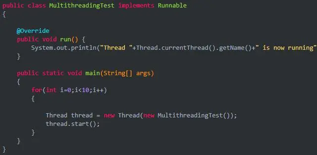 下面的代码创建了一个类,实现java.lang.Runnable接口并重载了run()方法。然后我们实例化一个Thread对象,调用该对象的start()方法。
