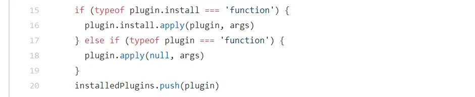 如果传入的是对象,执行install函数,如果是函数,也执行。然后将这个插件放入初始申明的数组里面