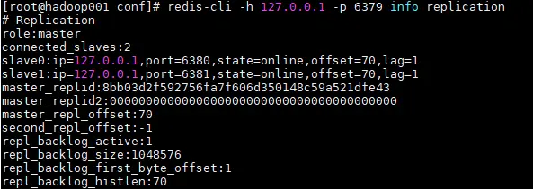 可以使用 info replication 命令查看 Redis 复制集的状态,此时输出如下。可以看到 6379 节点为 master 节点,并且有两个从节点,分别为 slave0 和 slave1,对应的端口为 6380 和 6381: