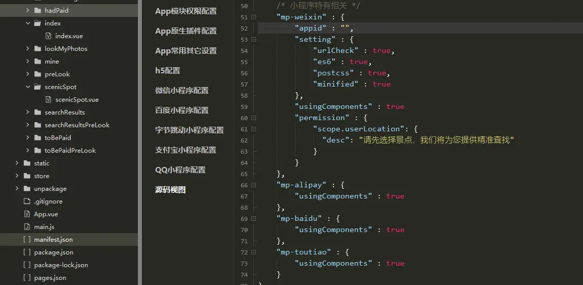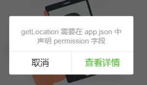 微信小程序 uniapp 地理位置授权失败 —getLocation:fail no permission(app.json中声明permission字段) bug爱好者 2020-01-06 7,247 阅读1分钟 当在项目中,使用定位功能,报错getLocation:fail no permission,或者如图 解决方法如下: 在manifest.json文件里配置permission "permission" : { "scope.userLocation": { "desc": "请先选择景点,我们将为您提供精准查找" } } 实现效果如图