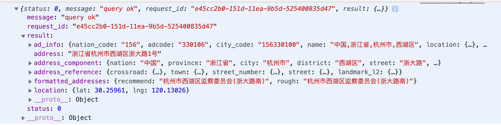 reverseGeocoder 接口返回的结果,这里面的字段比较多,详细可以看接口文档,里面好几个字段可以取到城市,其中 ad_info 是行政区划信息,我就取这里面的 city 了。