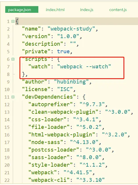 在package.json文件中,我们可以找到scripts 字段,打包指令过于臃肿,我们可以在此处进行指令简化"scripts":{"bundle": "webpack"}