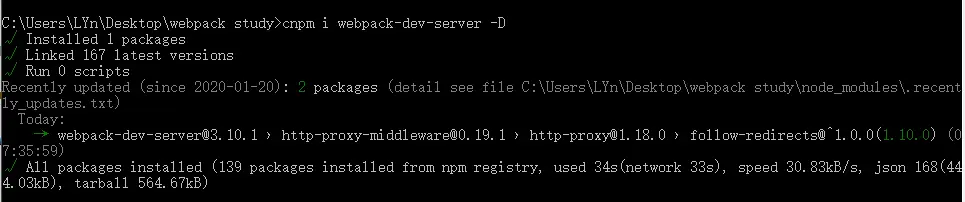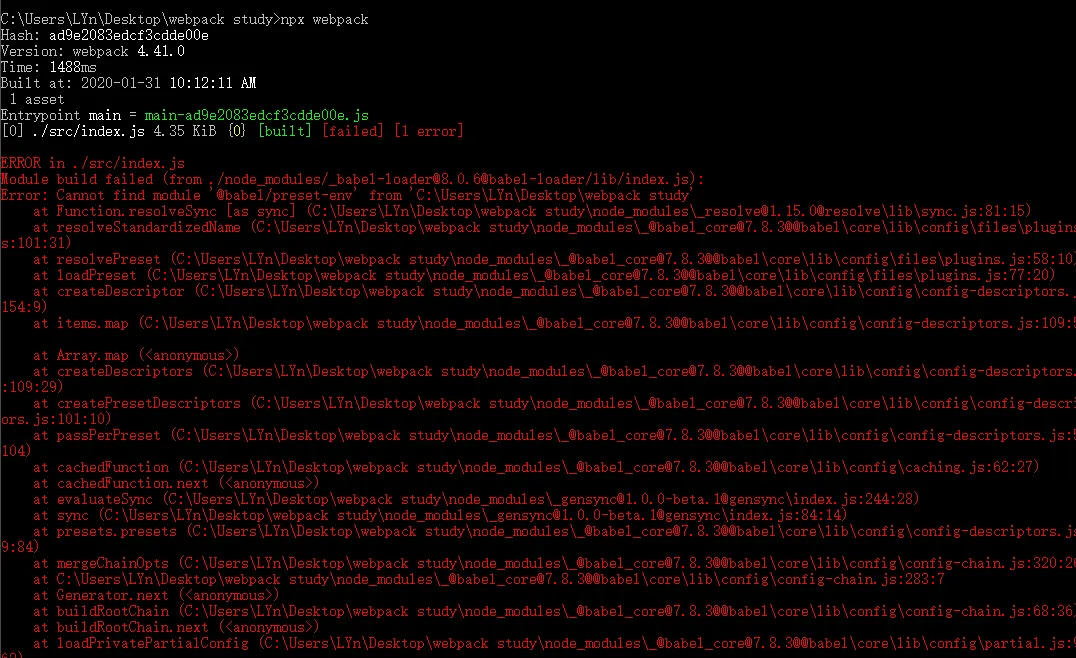 接下来再执行 npx webpack 会依次出现 cannot found html-webpack-plugin 和 cannot found clean-webpack-plugin .