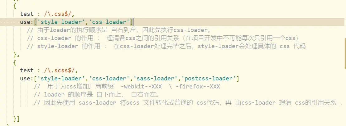 // 因此先使用sass-loader 将scss 文件转化成普通的 css代码,再 由css-loader 理清 css的引用关系 ,最后由style-loader 解读样式代码
