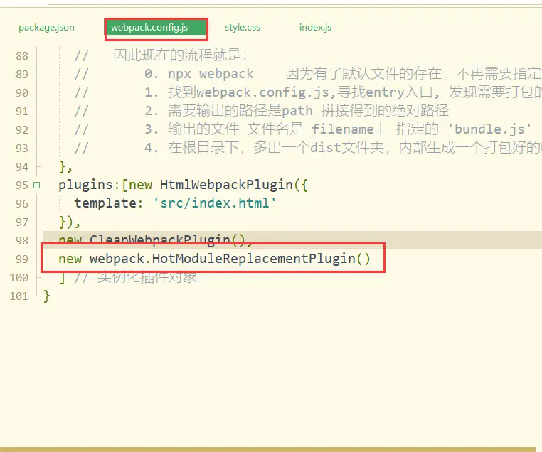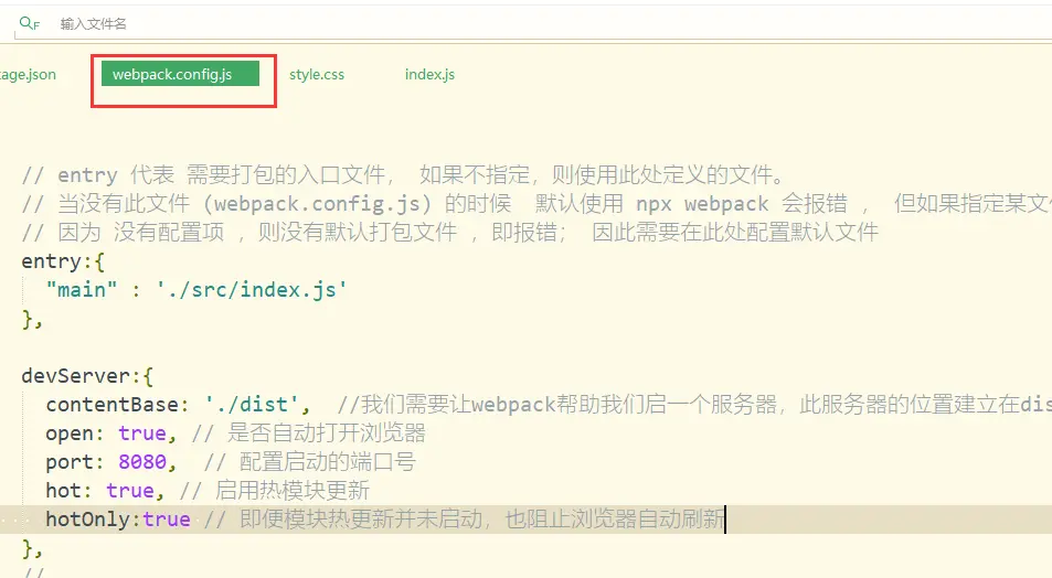 我们先到webpack.config.js中,为dev-server项添加 hot: true字段,意为启用热模块更新;安全起见,再添加一条 hotOnly:true 意为即便热模块更新没有启用,那么也阻止浏览器自动刷新