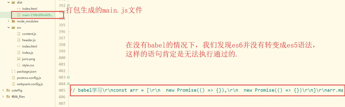 接下来我们使用npx webpack 进行打包(不使用webpack-dev-server打包的原因是:此方法会将打包的结果储存在内存里,我们就无法观察有无babel情况下打包的异同)