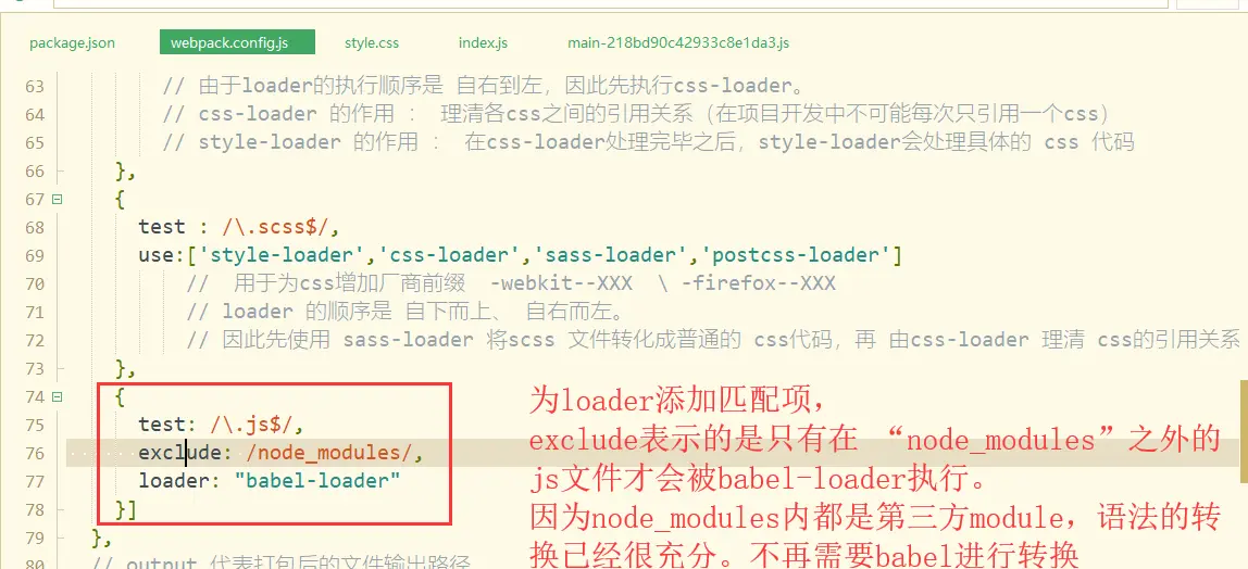 exclude: /node_modules/, // 因为node_modules 下的js文件都是第三方模块,已经做好了处理