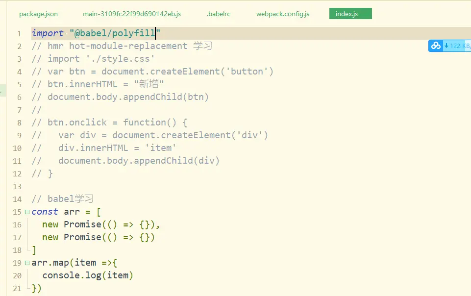 所以我们需要优化,我们只希望babelpolyfill补充我们在index.js中使用到的es6新语句。 修改webpack.config.js 的配置项: