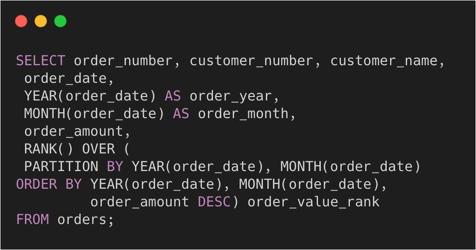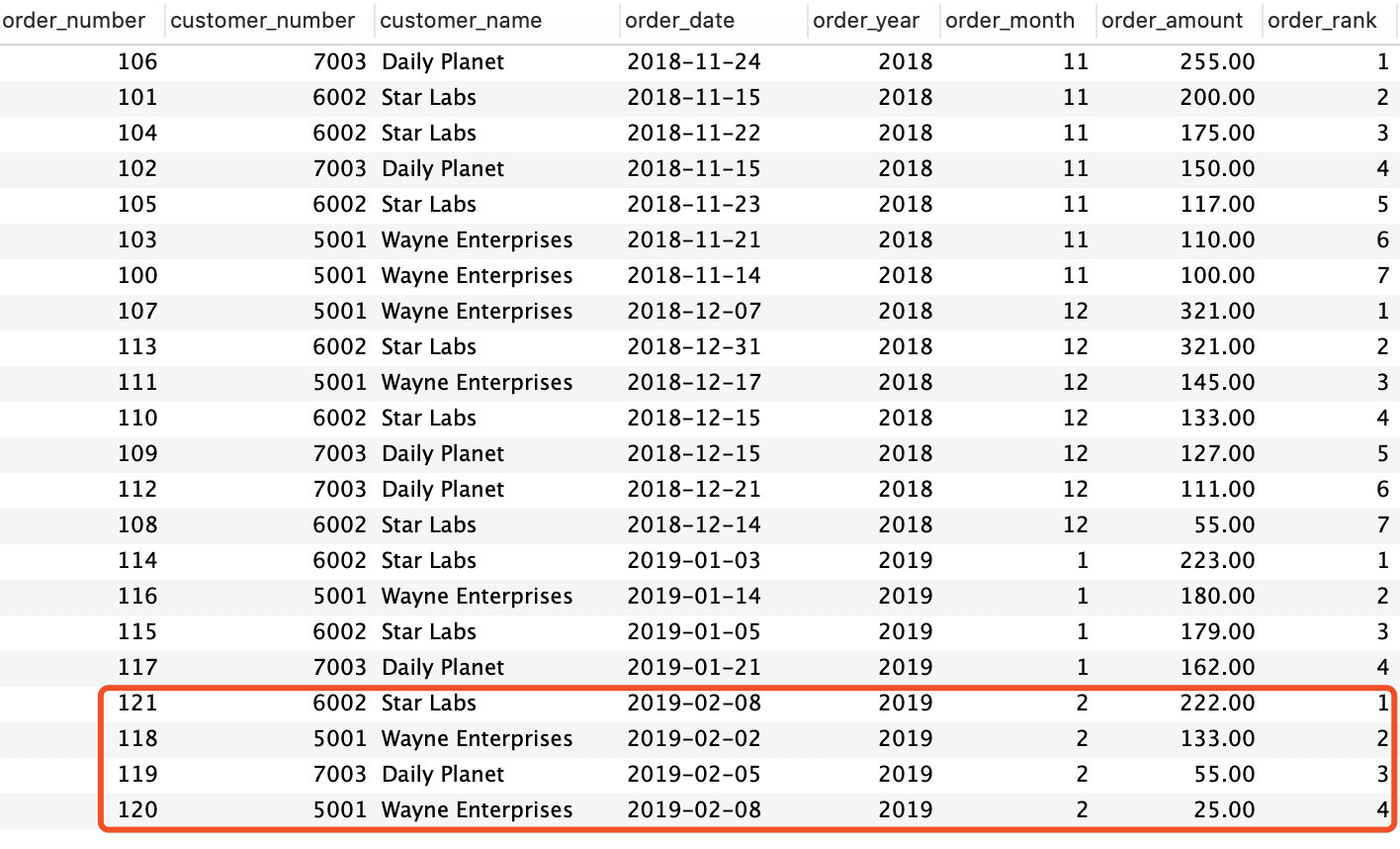可以看到,根据年、月、订单金额排序了,还多了一列order_rank,显示出了本条记录在本月的订单金额排名情况。