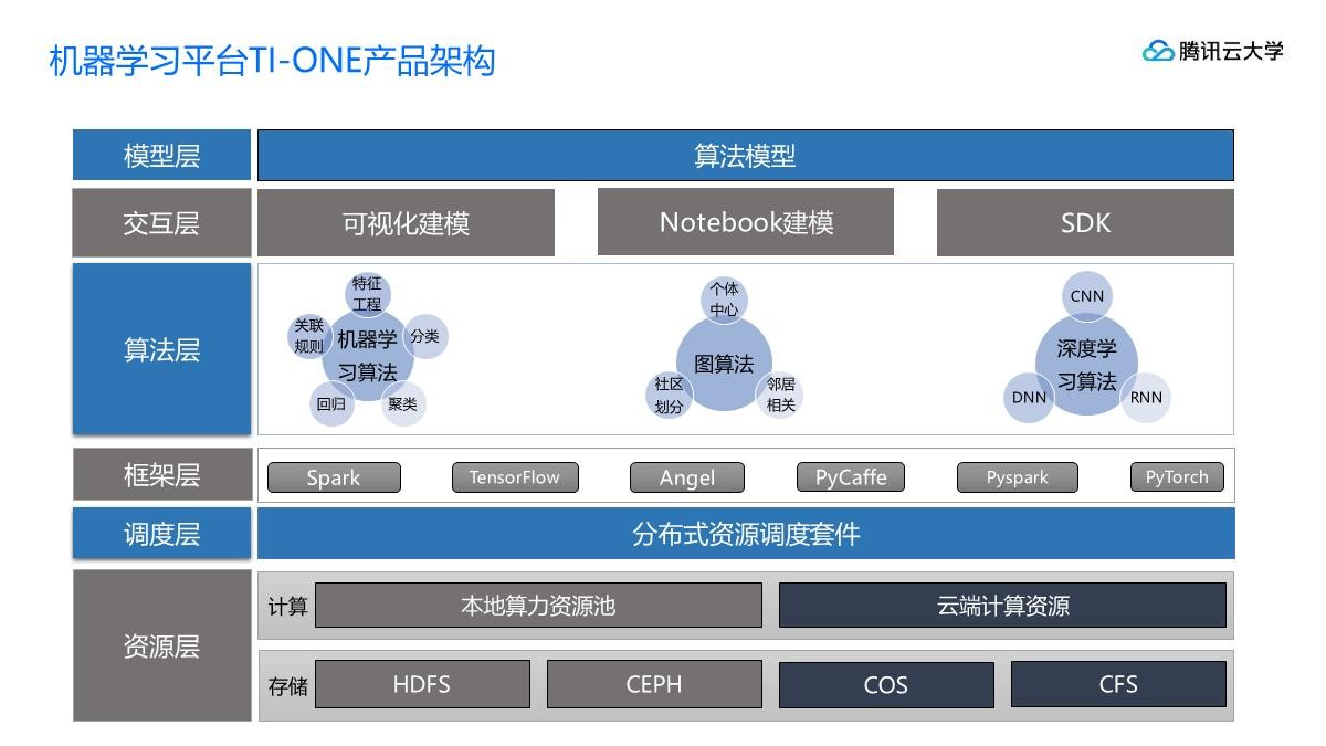 TI-ONE采用经典的分层架构模型,从上到下分别是交互层、TI内核引擎层、算力层和存储层。