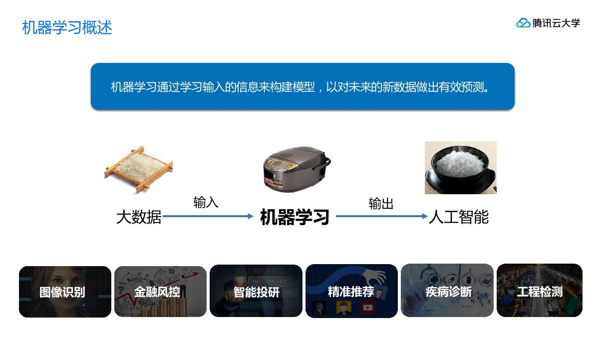 目前,机器学习已经拥有广泛的应用场景,如图像识别、金融风控、智能投研、精准推荐、疾病诊断、工程检测等等。