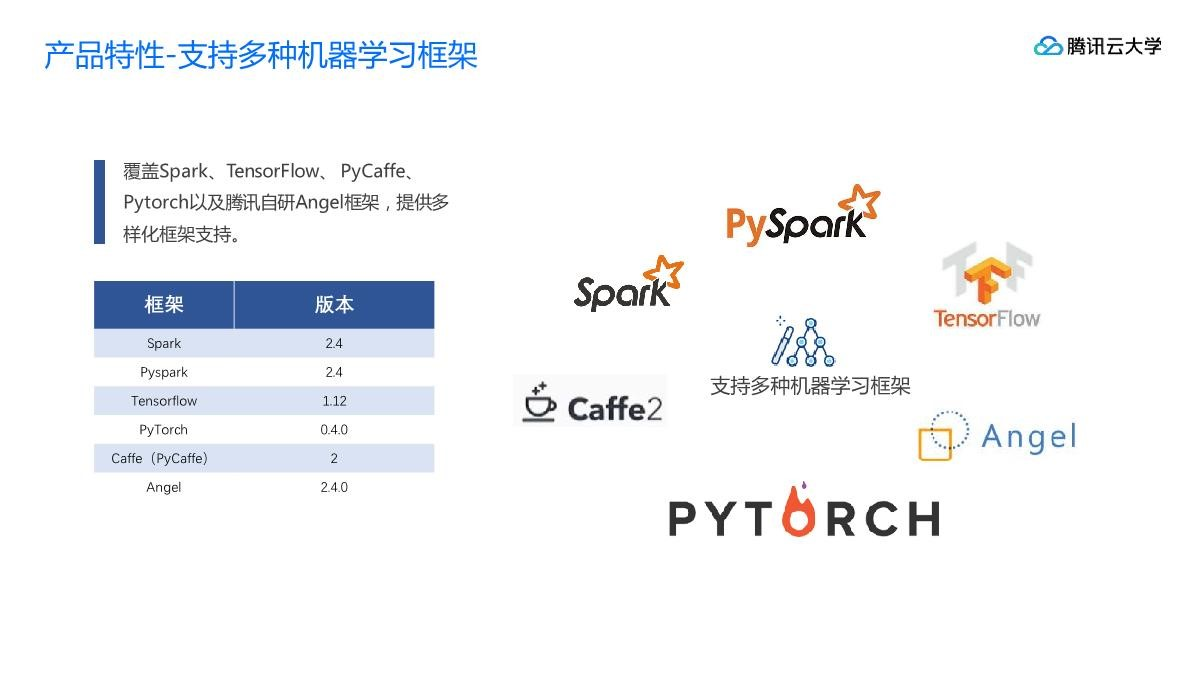 覆盖Spark、TensorFlow、 PyCaffe、Pytorch以及腾讯自研Angel框架,提供多样化框架支持。