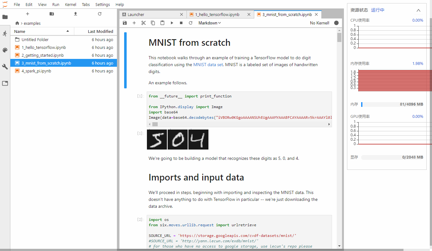 Notebook 作为一个灵活的交互式开发工具,非常适合于数据准备、数据处理、算法调试与模型训练。平台对Jupyter Lab进行了封装,在保留原有的交互特点上,增加了资源监控特性,可监控任务的资源消耗情况。