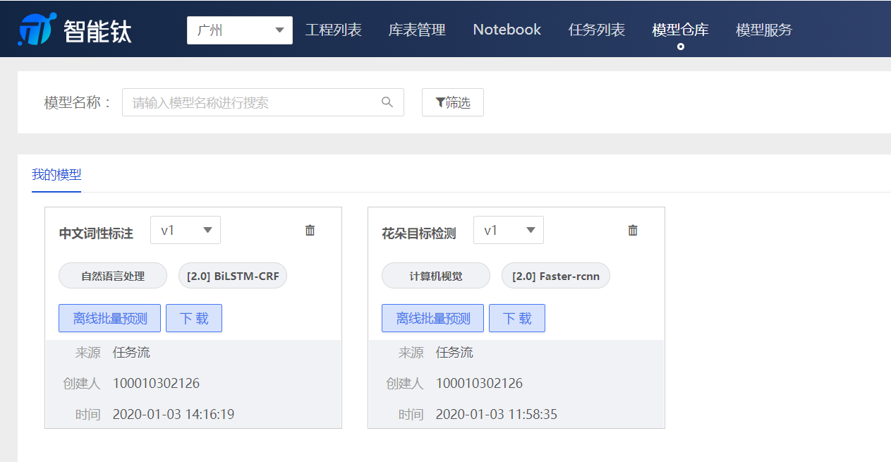 模型仓库页面用于管理所有保存的模型。支持以下功能: